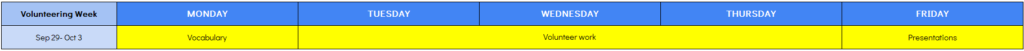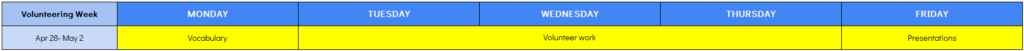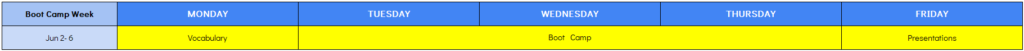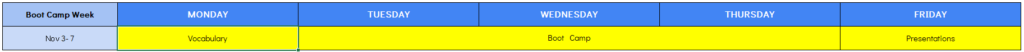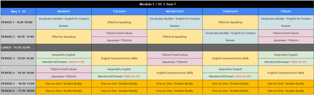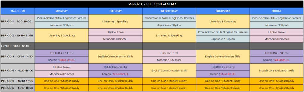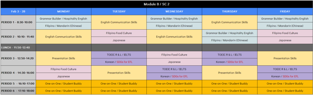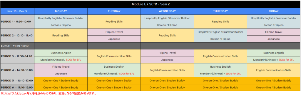 1コマ~4コマ(各90分)が、英語による「レクチャー型(座学)授業」です。薄いオレンジ色の部分が「選択必須科目」となり1科目は必ず履修していただきます(最大5科目の履修が可能)。同じコマ(時間帯)に複数科目がある場合は、同時間帯に行われる裏授業であり、いずれかの選択となります。科目選択は自由ですので、ご自身の目的に合わせて選択してください。
