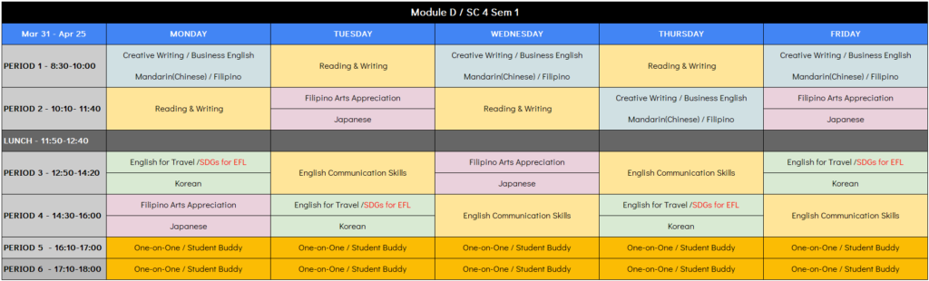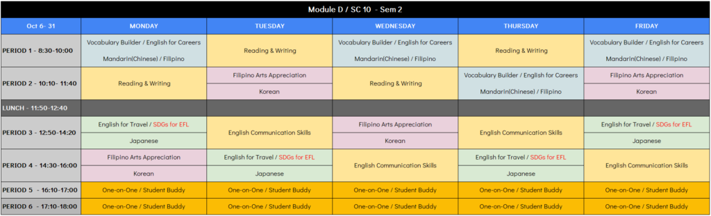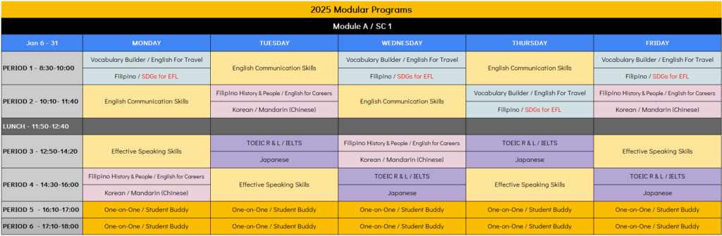 5コマ・6コマ(各50分)は、英語による「マンツーマンレッスン」です(実施は自由)。英語教員による個人レッスン『One On One(200ペソ)』か、現地フィリピン人学生との個人レッスン『Student Buddy System(無料)』となります。