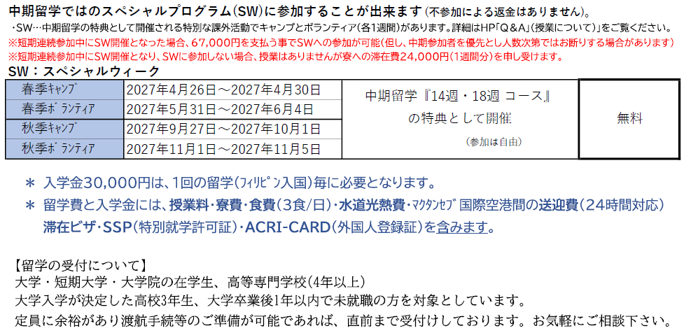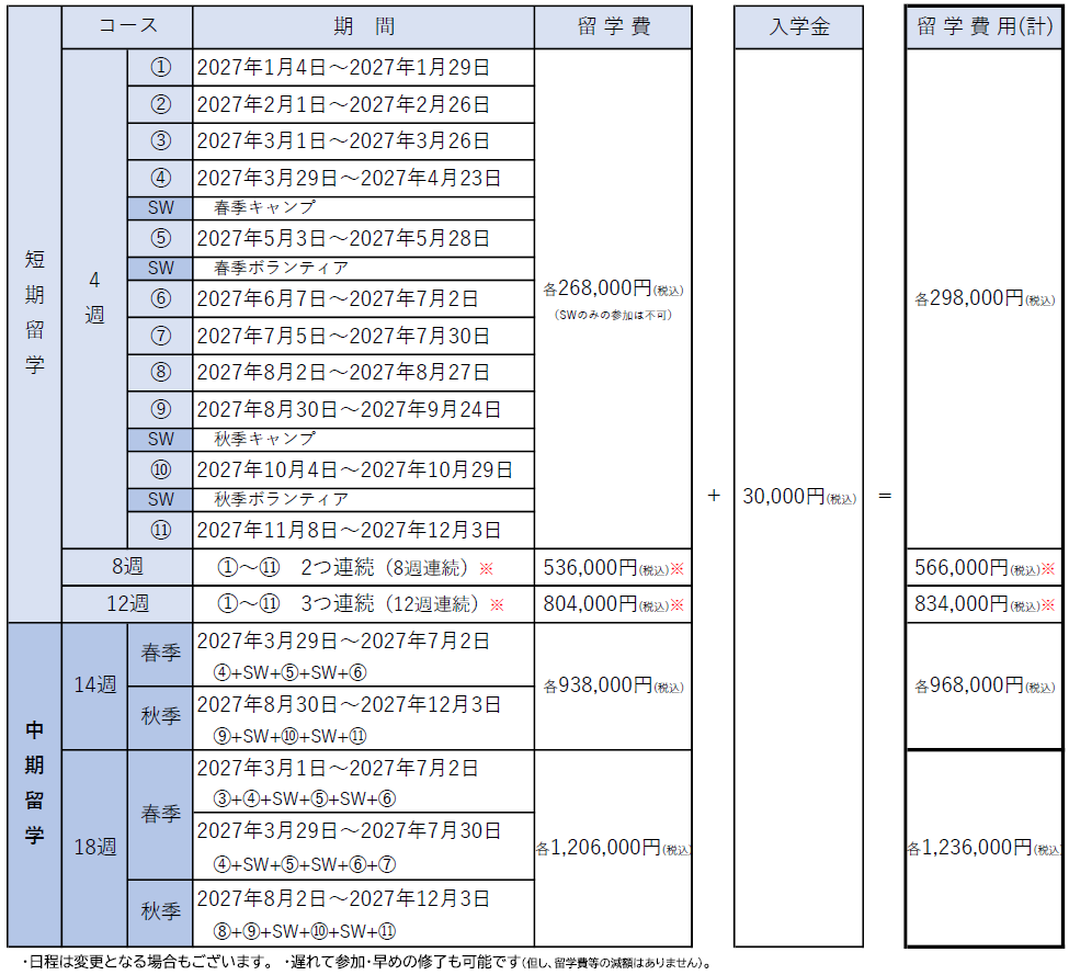 2027年1月以降の留学費はしばらく「未定」と表示させていただいておりましたが、この度以下の通り新価格を決定をさせていただきました。ご理解賜りますようお願い申し上げます。