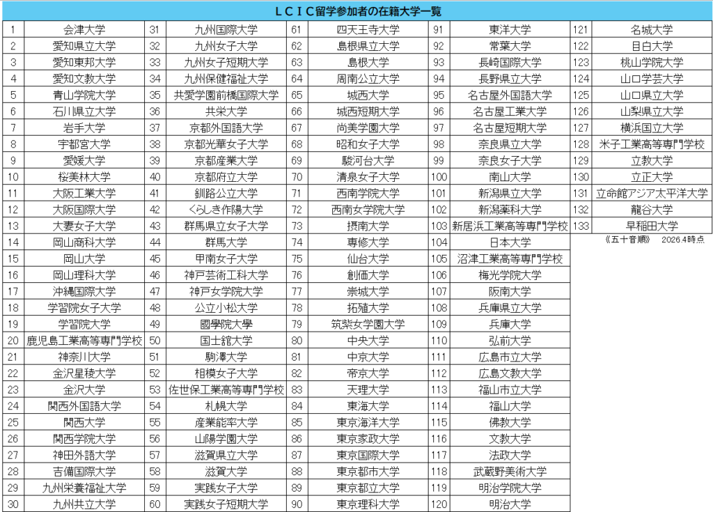 留学参加者在籍大学一覧(日本のみ)